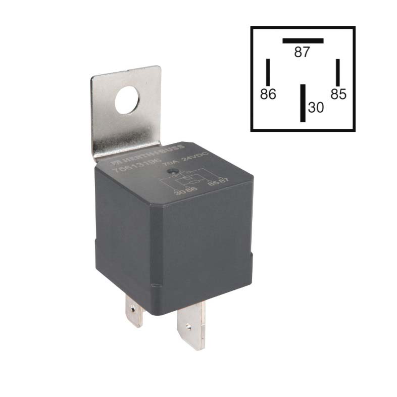 RELÉ 24V 4 LÁBAS 70A TARTÓFÜLLEL